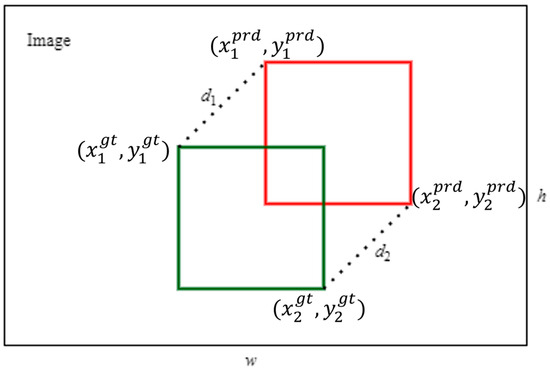 MPDIoU is based on the minimum distance of the point, which contains all the relevant factors considered in the existing loss functions, such as the overlapping or non-overlapping areas, the central point’s distance, and deviations in width and height, while simplifying the calculation process. , denote the predicted and ground-truth box coordinates, respectively. , denote the top-left and bottom-right point coordinates of . , denote the top-left and bottom-right point coordinates of . denote the width and height of the input image. The calculation factors of the MPDIoU loss function are shown in Figure 10. The calculation formula for the MPDIoU loss is as follows.