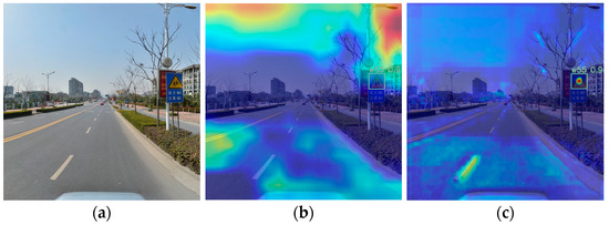 A heat map is a data visualization technique used to represent the relative density or degree of each data point in a dataset. In fields such as image processing and object detection, heat maps are commonly used to represent the model’s response or attention distribution to input data. To highlight the efficacy of the proposed model in detecting tiny traffic signs, heat maps are used from both the YOLOv8n and CTM-YOLOv8n models, as shown in Figure 11. In particular, as shown in Figure 11c, the TOD layer in CTM-YOLOv8n provides more detailed attention to tiny traffic signs.
