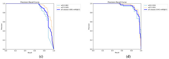 PR curve for networks: (a) YOLOv8n model; (b) CTM-YOLOv8n model; (c) YOLOv8n model; (d) CTM-YOLOv8n model.