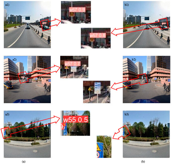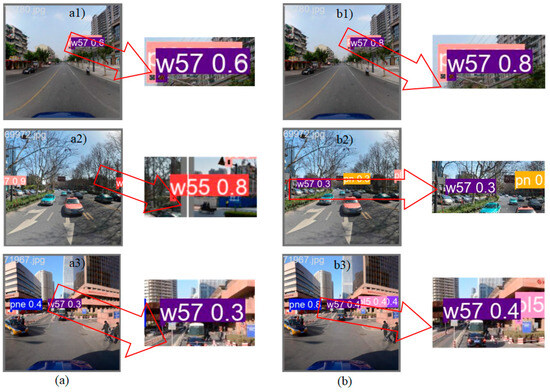 In the illuminated scene, traffic signs of category ‘w57’ were detected with a confidence level of 0.6, shown in Figure 14(a1), while in Figure 14(b1), traffic signs of category ‘w57’ were detected with a confidence level of 0.8, indicating better detection accuracy. Traffic signs of category ‘pl’ in the image can still be detected. The comparison chart for test results under the condition of directional light and occlusion is shown in Figure 14(a2,b2), with the traffic sign categories of ‘w57’ and ‘w55’ detected with confidence levels of 0.8 and 0.3, respectively. According to the YOLOv8n model, the ‘w57’ class on the right side of the image was not recognized, and the ‘pl’ class on the right side was identified as the ‘w55’ class. The CTM-YOLOv8n model effectively solves this type of problem. The comparison of test results under backlight conditions is shown in Figure 14(a3,b3). In Figure 14(a3), the blurred traffic sign of the categories ‘w57’ is detected with a confidence of 0.3. Correspondingly, in Figure 14(b3), the confidence level of ‘w57’ is 0.4, which is higher than the YOLOv8n model. The detection of other traffic signs is not affected and more categories of traffic signs can be detected. Our proposed CTM-YOLOv8n model can enhance the detection accuracy of traffic signs in the TT100K database without affecting the capacity of object classes.