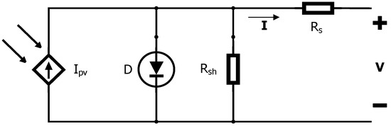 where is the number of series cells, is the Boltzmann constant (1.38 × 10−23 J/K), q is the electron charge (1.602 × 10−19 C), is the open-circuit voltage coefficient, is the nominal short-circuit current, is the nominal open-circuit voltage, is the series cell voltage, is the reverse saturation or leakage current. The current to be taken from the PV panel output is obtained by Equation (4) [50].