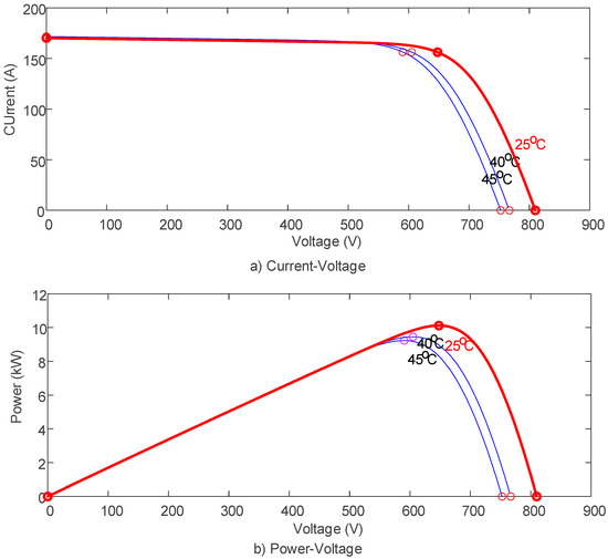 Equation (5) expresses the current for the PV equivalent circuit including both series and parallel resistors. The PV equivalent circuit is shown in Figure 1. Figure 1 shows the circuit model used to model PV systems, from which the most basic equations are derived. Due to its simple structure, it is frequently used in the modeling of PVPSs. Figure 2 shows the current–voltage and power–voltage graphs of the PVPS. Figure 2 shows the maximum power point that enables maximum power to be generated in PVPSs. Although power can be obtained from the PV power system at every point, maximum power can only be provided at and around a point. Figure 1 and Figure 2 also show the decrease in the generated power with increasing temperature.