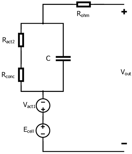 FCs are electrochemical energy conversion devices that convert the chemical energy of fuel into electrical energy. Depending on the electrolyte type, FCs are named and developed as proton exchange membrane (PEM) FC, alkaline FC, molten carbonate FC and solid oxide FC. FCs are an alternative source for transport and power generation from a fixed point [3]. The FC electrical equivalent circuit model is shown in Figure 3 [3,51]. FC internal voltage is expressed as the thermodynamic potential in the open-circuit state. It is calculated by the Nernst equation using hydrogen and oxygen pressure and cell temperature [51].