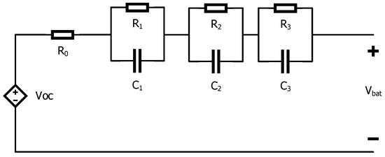 Although many types of batteries are used in electric vehicles, Li-ion batteries are the most suitable for electric vehicles. Li-ion batteries are the most suitable battery type because they have high energy density, low maintenance requirements and long service life [52]. Electrical equivalent circuit models used to describe the electrical behavior of batteries consist of circuit elements such as voltage source, resistor and capacitor [52,53]. Simple battery models with a voltage source and a series resistor may not accurately represent the true characteristics of electric vehicle batteries. Among the battery-equivalent circuit models, one RC equivalent circuit model, two RC equivalent circuit models and three RC equivalent circuit models are widely accepted circuit models [52]. Two or more parallel RC circuits are added to best reflect the characteristics of a battery. While the addition of many more parallel RC circuits provides high estimation accuracy, estimating parameters is much more difficult [54]. In the equivalent circuit in Figure 4, the voltage source represents the open-circuit voltage of the battery. Resistance is used to account for the contact resistance between parts such as electrolyte material, diaphragm resistance and electrolyte. The parallel RC circuit structure expresses the polarization internal resistance and capacity and reflects the dynamic characteristic of the diffusion and polarization effect of the battery [53].