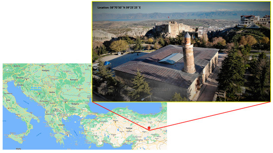 The coordinate values of the historical city and its location, where the simulation study was carried out by taking the irradiance and temperature values, are shown in Figure 5. In this historical city, it is not appropriate to extend electric vehicle charging stations to every location due to its historical structure. In addition, the installation of PVPSs using large areas or the installation of high wind turbines is not suitable for the natural structure of the historical city. The irradiance and temperature data used in this study in Figure 6 and Figure 7 are published in reference [57] as measured values with 15 min periods. For these reasons, the irradiation and temperature data of August and January given in Figure 6 and Figure 7 are used in the modeling of the power generation of the PV panels. Thus, this study aimed to create system models where a significant portion of the electric vehicle charging load can be met from the PVPS.