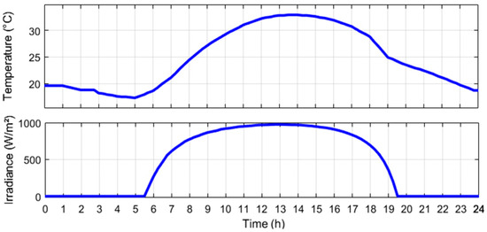 In the proposed system, the energy management algorithm was tested with three different scenarios. With three different load types and two different irradiance and temperature values for summer and winter, the system was simulated and the results were obtained. The simulation was carried out using August data with high irradiation and temperature values for summer months with high electric vehicle power demand in Scenario 1. The temperature and irradiance values used in Scenario 1 are shown in Figure 11. The simulation was performed by applying residential load demand and electric vehicle load demand in the summer months. In Scenario 1, during the daytime hours when the load demand is high, the PVPS meets the majority of the demand and transfers power to the system. The changes in the power graphs for this case are shown in Figure 12. Due to the high load, the surplus PV power generation will be lower than in Scenario 2; for this reason, the hydrogen production also remains at a lower value. When PV power generation is not sufficient, the FC is activated to support the PVPS. In the system, fast charging was constantly activated due to high irradiance values.