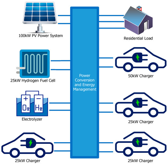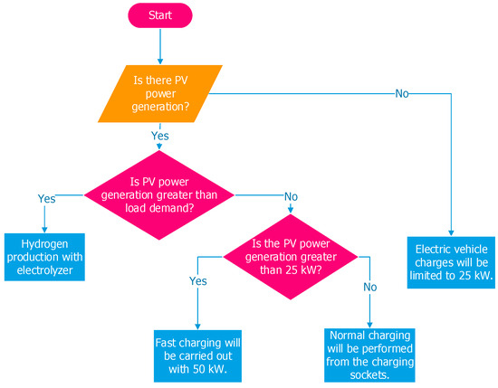 The power management algorithm of the proposed system is shown in Figure 8. Power management is based on meeting electric vehicle charging by generating electricity with the PVPS. The surplus PV power is converted into hydrogen and stored. During the hours of no or low solar radiation, the stored hydrogen is converted into electrical energy by FC and meets electric vehicle charging and residential load demand. The power management system first checks whether there is solar irradiation. If there is no or a very low level of irradiation, the FC will be activated and feed the system with a maximum power value of 25 kW. If PV power generation is available and there is surplus PV power after meeting the entire load demand, it is converted into hydrogen and stored. If PV power generation cannot meet the load demand, it is checked whether there is PV power generation greater than 25 kW. If the PV power generation is greater than 25 kW, fast charging with 50 kW is supported; if it is smaller, normal charging is carried out from the charging sockets. With the proposed system, this study aims to design a simple and stable power management algorithm using renewable energy sources, so that electric vehicle charging can be easily adapted to a building or an enterprise located in a protected area or on a historical site that does not need the electricity grid. The recommended charging system design is shown in Figure 9.