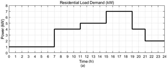 To enable electric vehicle charging, DC charging sockets which charge at 800 V DC voltage with 50 kW and 25 kW power values and an AC charging socket with 7.4 kW power are planned. As a load profile, the residential load demand and electric vehicle load demand scenarios were applied as shown in Figure 10. An electric vehicle battery assumed an average capacity of 60 kWh. The production of electricity from solar energy, which exceeds the load demand is evaluated for hydrogen production. In the applied scenario, the residential load demand reaches a peak value between 15 and 19 h and the electric vehicle charging demand reaches a peak value between 14 and 15 h in summer and a peak value between 9 and 18 h in winter. In the case of exceeding load demands for PV power generation or at night when there is no PV power generation, the FC is activated and meets the power demand. The 25 kW and 50 kW charging sockets are available for use during daylight hours when PV power generation is active. The 7.4 kW charging socket provides all-day electric vehicle charging. The residential load demand can be met in full during the day and night.