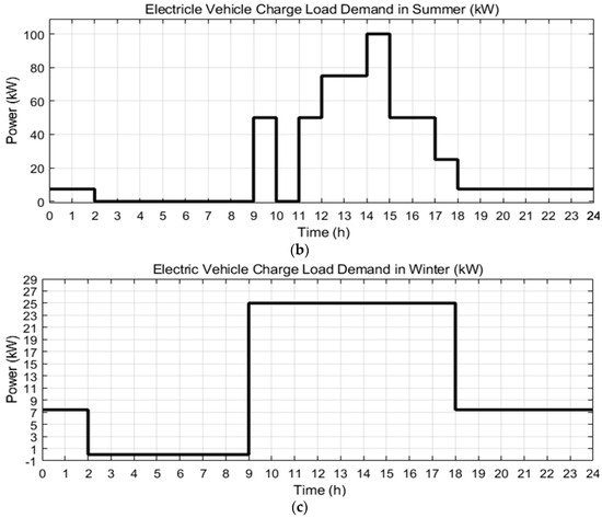 Residential and electric vehicle load demand scenarios: (a) residential load demand (kW); (b) electric vehicle charge load demand in summer (kW); (c) electric vehicle charge load demand in winter (kW).