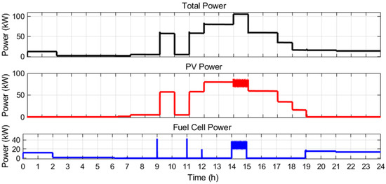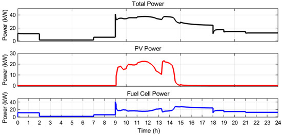 For Scenario 2, variation in total power demand and supplied power to the system by PV panel and fuel cell.