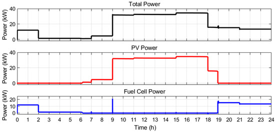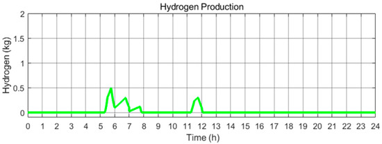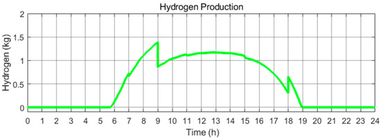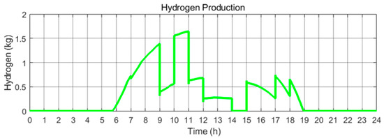 As shown in Figure 13, in Scenario 2, the test of the system for the low load demand case was carried out by simulation using the high irradiance values of August in the historical and tourist regions. Residential load demand and electric vehicle load demand, which can be generally faced in winter months, have been applied to the power system. In this scenario, due to the low load demand and high PV generation in the system, most of the produced PV power is used for hydrogen production. According to the maximum hydrogen production values obtained in Figure 14, a hydrogen tank with a capacity of 20 kg will be sufficient to store hydrogen. There was no need for the FC to operate during daylight hours. During the hours when the irradiance is very low or absent, the FC is activated to meet the electrical energy required by the system. In addition, the high irradiation level and low load demand ensured that the fast charging was continuously activated during daytime hours.