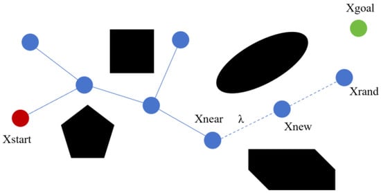 The RRT algorithm’s fundamental arithmetic logic is depicted in Figure 1. With acting as the root node, the search tree spreads out and investigates an uncharted area that is full of barriers. To create a new node in the tree, the sampling function takes a point on the line between and with a step of λ. It then finds the closest node in the tree by sampling uniformly and randomly throughout the exploration space to produce a sample point . This procedure is carried out repeatedly until the new node of the search tree finds a workable connection between and or until the new node is close to the target point .
