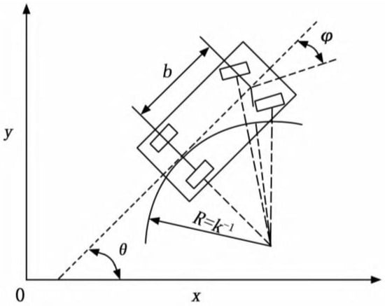 The center of the rear axle of the vehicle is taken as the reference point of the vehicle, is the wheelbase of the vehicle, is the turning angle of the front wheels, is the heading angle, is the turning radius, and is the path curvature. Assuming that the velocity of the vehicle is , then the kinematic equations of the vehicle can be obtained according to Figure 3 as in Equation (3):