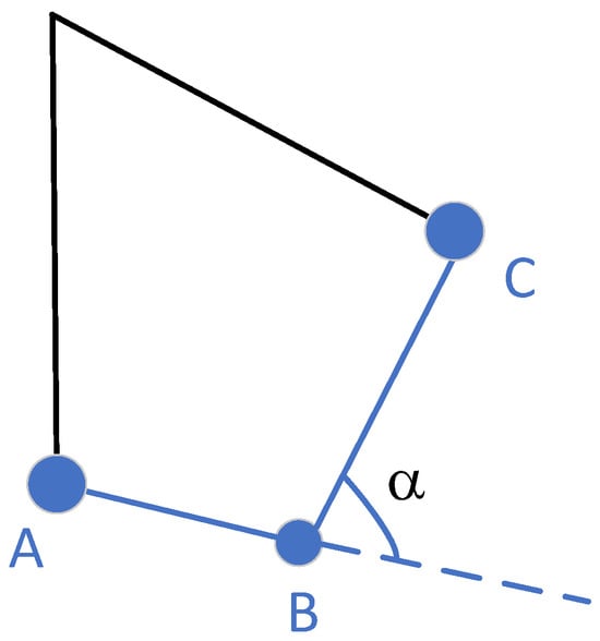 To ensure the stability of driverless vehicles that are tracking the planned path of travel, the steering wheel corner does not produce sudden changes, and the path curvature must remain continuous. The curvature constraints are satisfied. The construction of the random tree is carried out under the non-complete constraint of the front wheel turning angle introduced in the search process of the algorithm. As shown in Figure 4, the node A-B line and the node B-C line have an angle and a general model wheel-turning angle between 30° and 40°; according to the above derivation, it can be known that the vehicle is subject to the kinematic constraints that need to meet the following Equation (5):
