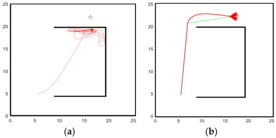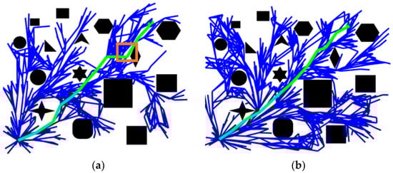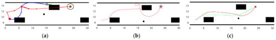 Scenario 1 is a parking lot scenario in which the simulation environment is a parking lot of size 50 m × 50 m, in which the black rectangles represent vehicles parked in the parking lot, all the road sections in the parking lot are unidirectional, and there is only the road section from the entrance to the exit, as shown in Figure 16a. The black dots represent pedestrians who are looking for vehicles. This scenario simulates the planned route of a car from its own parking space to the exit of the parking lot. Due to the special scene and relatively small environment, the RRT algorithm only uses objects as reference points. Here, based on the environment, the range of the obstacle is expanded, and the reservation of its contour distance is increased to ensure that no cuts or even collisions will occur because of its own contour distance and the surrounding body contour while planning the optimal driving route.