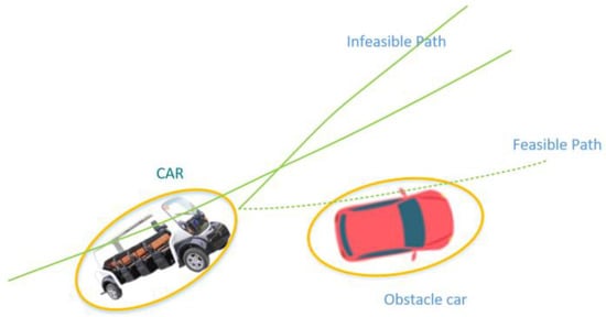While global planning ensures that vehicles are able to follow optimal routes based on known maps and static obstacles, local planning must deal with real-time dynamic changes in the environment, such as sudden pedestrians, bicyclists, small dogs that appear out of nowhere, or vehicles that move irregularly. These dynamic obstacles usually do not strictly follow traffic rules, thus requiring an advanced and flexible path planning method. Since it is difficult to predict the moving paths of obstacles, local path planning in dynamic environments is a hot topic in current research. For local path planning, the DWA [], artificial potential field [], and fuzzy path planner [] methods are widely used. The artificial potential field method plans paths with fast convergence and smooth paths. However, when facing complex dynamic environments, there are situations where the combined force is zero, and the smart car will stop moving in the middle of the movement process. The DWA algorithm, which is one of the most popular algorithms, was proposed by Fox et al. in 1997 [] and is still frequently used. The dynamic window approach combines the sampled multiple sets of velocities with the motion constraints of velocity and acceleration and then evaluates the simulated multiple sets of trajectories with an evaluation function and selects the optimal velocity corresponding to the trajectory as the vehicle’s drive. Compared with the artificial potential field method, this method is characterized by fast planning speed, safety and reliability, and good real-time performance [,,]. However, the path screened by the DWA algorithm using a function with fixed weights cannot be adapted to a complex dynamic environment. Later, Zhong [] et al. proposed an adaptive rolling window method based on obstacle edges and target points with reasonable safety and environmental applicability. Chang et al. [] combined Q-learning with the DWA algorithm and proposed two new evaluation functions. This demonstrated a high navigation efficiency and success rate in complex unknown environments but also brought a high time cost. Wu et al. [] combined the A* algorithm with the DWA algorithm to produce an algorithm that is closer to the global optimal path but is less smooth. Zhang et al. [] proposed a fusion method based on RT* and DWA. After generating the global path using RRT*, the DWA algorithm with deviation function is introduced to track the global path so as to obtain the optimal path and realize dynamic obstacle avoidance. However, the planned paths are poorly adapted to the environment. Jian et al. [] switched the use of RRT* and DWA to adapt to different obstacle environments, realizing the balance between real-time computation and a global optimal solution. However, the path is tortuous, and security is not guaranteed.