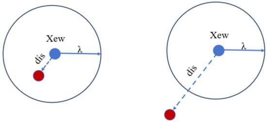 The improved method in this paper is the node-discarding method, further developed based on the node rejection method, as shown in Figure 8. Instead of setting the distance threshold artificially, this method uses the current step size λ as the judgment criterion. After a new node is generated, a circle is drawn with the node as the center and the current step size λ as the radius, and it is checked to find whether there is any other node within the circle. If there is, it means that the new node is located in or close to the explored region, so it is discarded; if not, it means that the new node is in the unexplored region, and it is added to the random tree. This improved RRT algorithm can improve the efficiency of path planning and exploration tasks, especially in complex environments, and can better balance the problems of exploration and repetitive search.