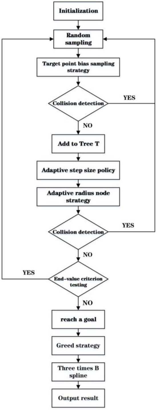 - In this paper, the RRT algorithm is improved by introducing a goal-biased random sampling strategy, collision detection, adaptive step-size strategy, adaptive radius node screening strategy, termination criterion, and greedy strategy. The improved RRT algorithm can generate paths conforming to the vehicle motion constraints more efficiently and reduce the repeated search of explored regions, thus significantly improving the efficiency and safety of path planning.