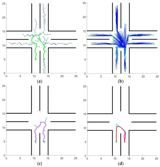 Simulation results of intersection turnaround experiment. (a) Traditional RRT algorithm; (b) RRT* algorithm; (c) RRT-connect algorithm; (d) improved algorithm in this paper.