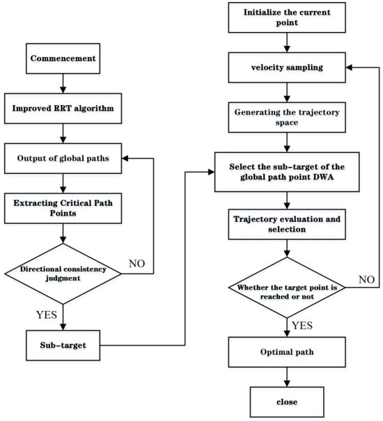 In summary, existing vehicle path planning algorithms have their advantages and shortcomings in practical applications, which usually need to be weighed in terms of algorithm performance, vehicle kinematics constraints, and path safety. Researchers want to solve the problems that traditional path planning methods often have high computational complexity, cannot avoid unknown dynamic obstacles, and quickly fall into local optimization. While traffic rules provide the infrastructure for road navigation, real-world scenarios often involve unpredictable factors such as pedestrians, animals, or other vehicles that do not follow these rules. In this paper, we propose a fused path planning algorithm based on improved RRT and DWA. The method achieves safe and efficient navigation by dynamically adapting to unpredictable obstacles, thus extending the application of traditional traffic-rule-based navigation systems to more complex and irregular environments.