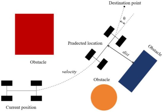Dieter Fox and Sebastian Thrun proposed the dynamic window approach (DWA) algorithm in 1997. To obtain the optimal predicted trajectory that complies with the vehicle kinematics model and outputs the speed and angular velocity for real-time obstacle avoidance, the DWA algorithm first limits the velocity space by the vehicle kinematics model, then generates the predicted trajectory in the forward simulation time and evaluates the predicted trajectory through the evaluation function. The evaluation function determines the best-predicted trajectories by the vehicle kinematics model by evaluating the generated predicted trajectories for obstacle avoidance capability, speed, heading, angle, and other factors. It then outputs the speed and angular velocity for real-time obstacle avoidance.