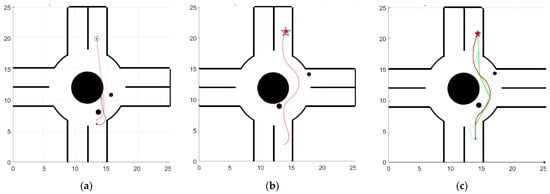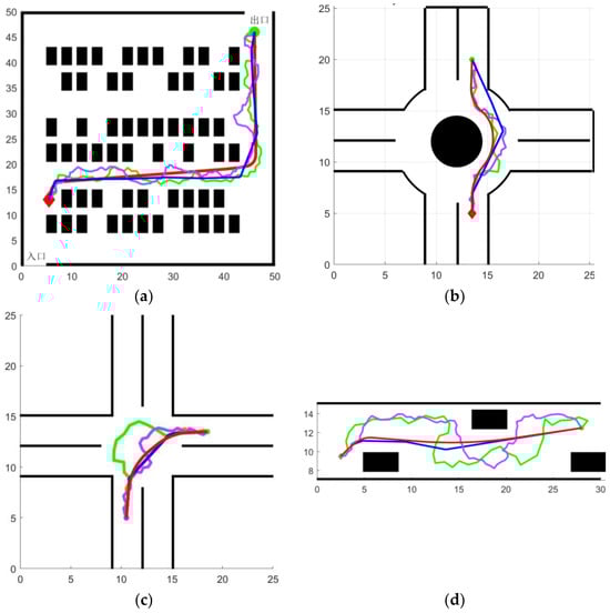 Scenario 2 is a roundabout scenario in which the simulated environment is a lane with a unidirectional width of 2.5 m and a small urban unsignalized roundabout with a diameter of 17 m. Vehicles enter the roundabout from the right side of the road below and exit at the third exit of the roundabout, as shown in Figure 16b. The black dots represent pedestrians and non-motorized vehicles crossing the intersection in this scenario.