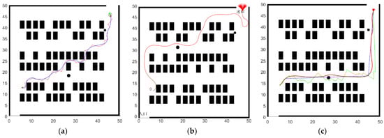 In order to further verify the superiority of the fusion algorithm proposed in this paper, comparative experiments with the RRT and DWA fusion algorithm, the improved DWA algorithm, and the improved fusion algorithm in this paper are conducted on the parking lot scenario map, as shown in Figure 17. As can be seen from Figure 17, all three algorithms successfully find the path from the starting point to the destination in an environment containing unknown and dynamic obstacles. However, the path planned by the RRT algorithm, as shown in Figure 17a, is not flat and is accompanied by steep turns while running a path that does not meet our daily driving requirements. Moreover, the improved DWA algorithm, shown in Figure 17b, can realize dynamic obstacle avoidance, but the path has the disadvantages of being unsafe and not smooth, and it does not meet the driving conditions. As shown in Figure 17c, the improved fusion algorithm proposed in this paper has smoother paths and safer obstacle distances with smaller and fewer turning angles, which is more suitable for unmanned vehicle driving conditions.