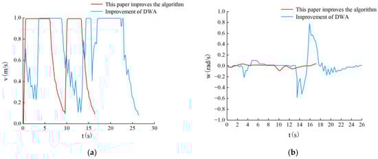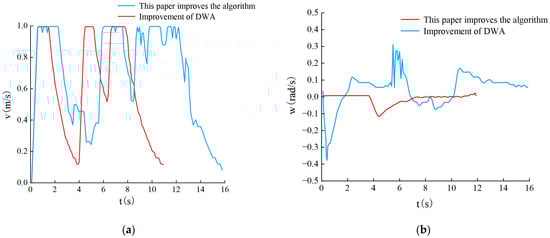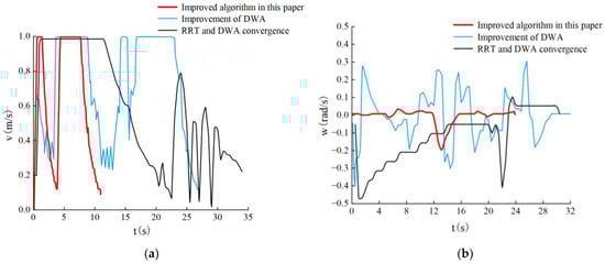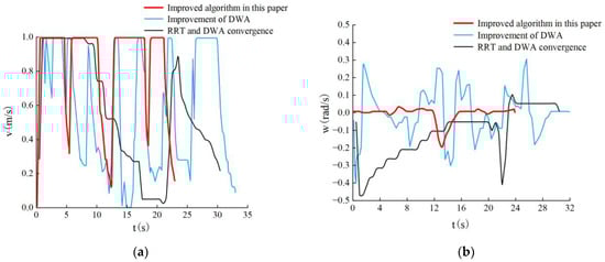 As can be seen from Figure 24, compared with the RRT and DWA fusion algorithm and the improved DWA algorithm, the linear velocity of the improved fusion algorithm in this paper exhibits greater stability, while the angular velocity exhibits less fluctuation. In the area without obstacles, the linear velocity stays within a stable range, reflecting the stability and efficiency of this paper’s algorithm in path planning. During the obstacle avoidance process, the adjustments of linear and angular velocities are fast enough and effective enough to ensure that the obstacle avoidance maneuver is smooth without losing its smoothness. Table 6 shows that the running time of the improved fusion algorithm in this paper is reduced by 54.2% compared with the improved DWA algorithm, respectively. In addition, the path length is reduced by 36.8%. In summary, utilizing the improved RRT and DWA fusion algorithm proposed in this paper not only enhances the safety of unmanned vehicle path planning but also ensures stability.