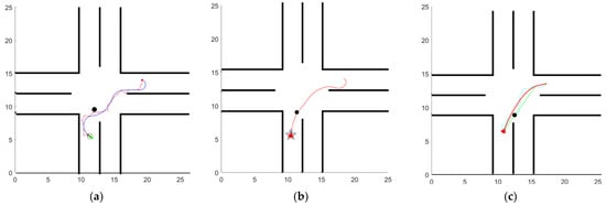 Scenario 3 is a left-turn intersection scenario in which the simulation environment is a small unsignalized intersection consisting of an urban roadway with a width of 2.5 m on one side. Vehicles enter the intersection from the right side of the intersection, moving from left to right, to make a left turn and exit the intersection downward to continue traveling, as shown in Figure 16c. The black dots are pedestrians and non-motorized vehicles crossing the intersection.
