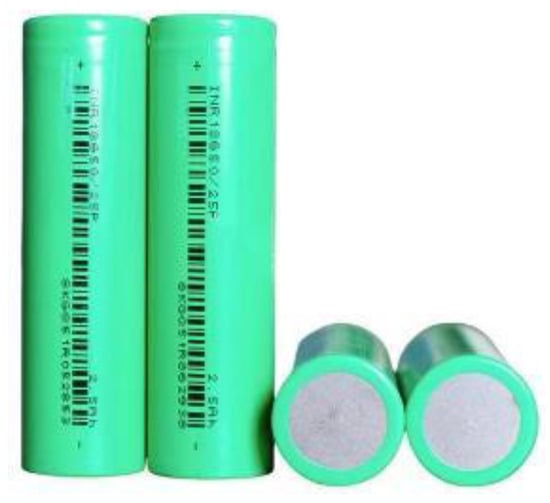 Currently, the widely used lithium-ion power batteries are mainly lithium iron phosphate batteries and lithium ternary batteries, of which lithium ternary batteries have the advantages of high energy density and excellent performance in low-temperature environments compared with lithium iron phosphate batteries. At the same time, the cylindrical lithium-ion battery is smaller in size and larger in surface area than the square battery, which is more suitable for the research of thermal management performance of phase change material cooling. Therefore, the 18650 ternary lithium-ion battery is selected as the research object, and its shape, specific specifications, and performance parameters are shown in Figure 1 and Table 1.