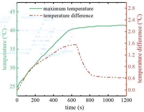 When the initial ambient temperature is 25 °C, the maximum temperature and the maximum temperature difference of the battery pack under the 3C discharge rate condition with the discharge time are shown in Figure 4. As can be seen from the figure, in the pre-discharge phase change material using phase change sensible heat to absorb the heat generated by the battery pack, the temperatures of the phase change material and the battery pack continue to rise. In the discharge time of about 600 s, the battery pack temperature reaches the melting point of the phase change material. At this time, the phase change material uses the phase change reaction to absorb the heat of the battery pack, and the temperature of the battery pack maintains in the vicinity of the melting point of the phase change. At the end of the discharge, the maximum temperature of the battery pack is 41.4 °C. The phase change material cooling has excellent thermal management performance. As can be seen from the curve of the maximum temperature difference of the battery pack, the addition of the phase change material also significantly improves the temperature uniformity of the battery pack throughout the discharge cycle of the battery pack. In the pre-discharge period, the maximum temperature of the battery pack gradually increases because the phase change material does not undergo a phase change reaction. The temperature difference of the battery pack is similar to that of the maximum temperature of the battery pack, and the phase change reaction of the phase change material starts to occur when the discharge time is about 600 s. Under the action of the phase change material, the maximum temperature difference of the battery pack decreases, and the temperature difference of the battery pack is maintained at about 0.4 °C in the late stage of the discharge. During the whole discharge process, the maximum temperature difference of the battery pack occurs at the moment before the phase change reaction occurs, which is 1.6 °C, much lower than the requirement of the maximum temperature difference of the battery pack of less than 5 °C.