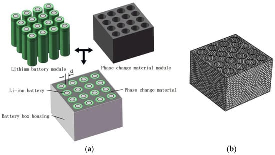 Cooling structure and mesh modelling of composite phase change materials. (a) Structural model for phase change cooling. (b) Mesh.