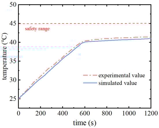 In order to verify the accuracy of the simulation model, according to the experimental battery pack model, the distance d between the battery cells was set to 4 mm, and the overall dimensions of the simulation model and the experimental model were the same as those of the simulation model, which were 92 mm × 92 mm × 65 mm. The initial temperature was set to be 25 °C, convective heat transfer coefficients were set to be 5 W/(m2·K) for the part in contact with the outside world in the simulation model, and parameters such as density and specific heat capacity were used. In the initial conditions, the density and specific heat capacity of the lithium battery are used, the thermal properties of the composite phase change material are consistent with those of the expanded graphite–paraffin composite phase change material prepared by the experimental values, the heating power of the battery is set to be that of the 3C discharge rate, and the simulation time is set to be 1200 s. Figure 6 shows the comparison curves of the maximum temperature of the battery pack with the discharge time under the ambient temperature of 25 °C and the comparison curves between the experimental and simulated values.