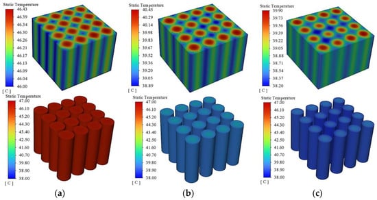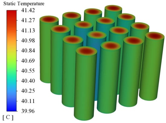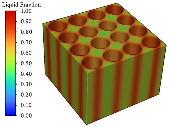 The simulation study not only monitors the overall temperature change of the battery pack, but also monitors the degree of melting of the phase change material, i.e., the liquid phase rate. The liquid phase rate can reflect the degree of utilization of the latent heat of the phase change and at the same time can evaluate the subsequent thermal management performance of the phase change material. Figure 7 shows the overall temperature distribution of the battery module at the end of discharge. As can be seen from the figure, the highest temperature of the battery module is located in the centre of the battery, and the surrounding heat is absorbed by the phase change material quickly, so the surface temperature is lower. Due to the existence of the phase change material, the overall temperature uniformity is good and the maximum temperature difference is within 2 °C. Figure 8 shows a cloud view of the liquid phase rate distribution of the phase change module at the moment of the end of the discharge. From this figure, it can be seen that the overall distribution of the phase change module liquid phase rate is relatively uniform and the liquid phase rate of the local phase change material around the cell is higher, but the overall liquid phase rate of the phase change material is lower, which is sufficient for subsequent thermal management performance. Therefore, further research can be carried out through this simulation model.