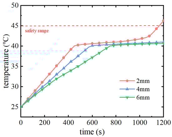 Figure 9 shows the maximum temperature change curve of the battery pack under different phase change material filling thicknesses. From the figure, it can be seen that the maximum temperature of the battery pack is increasing in the pre-discharge period, and with the increase of the filler thickness, the rate of increase of the temperature of the battery pack decreases and the time for the phase change material to start the phase change process is delayed. The increase in the filling mass of the phase change material will use sensible heat to absorb more heat from the battery pack in the early stage, delaying the time to reach the melting point of phase change. At different filling thicknesses, the cell temperature reaches the phase transition melting point at 400 s, 550 s, and 680 s, respectively. Since the melting points of the phase change materials are the same, the latent heat of phase change continues to be used to absorb the heat generated by the battery pack after the phase change occurs, maintaining the maximum temperature of the battery pack unchanged. However, at the end of the discharge period, when the thickness of the phase change material is 2 mm, due to the insufficient filling quality of the phase change material, the phase change material completely melts and the latent heat of phase change is exhausted, so it cannot continue to absorb the heat from the battery pack, resulting in a rapid increase in the temperature of the battery pack. When the thickness of phase change material is 2 mm, 4 mm, and 6 mm, the maximum temperatures of the battery pack are 46.26 °C, 40.98 °C, and 40.67 °C, respectively.
