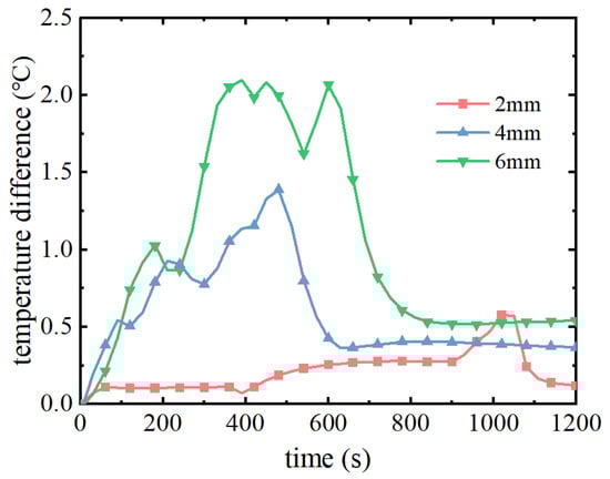 Figure 10 and Figure 11 show the cloud diagrams of the maximum temperature difference of the battery pack and the overall temperature distribution of the battery module, respectively. From Figure 10, it can be seen that in the pre-discharge period of the battery pack, the maximum temperature difference increases continuously with the discharge time, and when the phase change melting point is reached, the phase change process makes the maximum temperature difference start to decrease rapidly. As the filling thickness of the phase change material decreases, the time to reach the melting point of the phase change is also accelerated and the start time of the phase change process is advanced, so the maximum temperature difference also decreases. When the filling thickness is 2 mm, 4 mm, and 6 mm, the maximum temperature difference is 0.57 °C, 1.39 °C, and 2.19 °C. As can be seen in Figure 11, the overall temperature distribution of the battery pack is basically the same under the different filling thicknesses of the phase change materials, with the highest temperature in the middle of the battery pack, and then decreasing to the surrounding area. With the increase of the filling thickness of the phase change material, the overall temperature of the battery pack also decreases; the maximum temperature decreases by 5.28 °C when the filling thickness is increased from 2 mm to 4 mm; the maximum temperature decreases by only 0.69 °C when the filling thickness is increased from 4 mm to 6 mm.