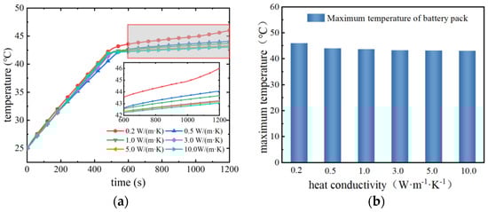 Variation of maximum temperature of battery pack with different thermal conductivities. (a) Variation of maximum temperature with discharge time. (b) Maximum temperature with different thermal conductivities.