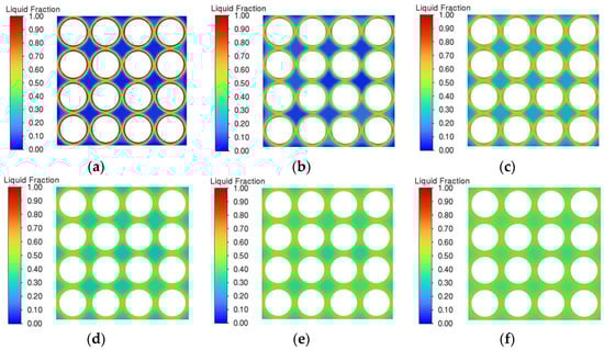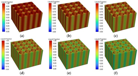 Liquid phase ratio distribution with different thermal conductivities at the end of discharge. (a) 0.2 W/(m·K). (b) 0.5 W/(m·K). (c) 1 W/(m·K). (d) 3 W/(m·K).(e) 5 W/(m·K). (f) 10 W/(m·K).
