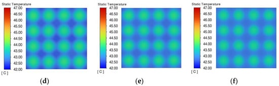 Temperature distribution at the end of discharge with different thermal conductivities. (a) 0.2 W/(m·K). (b) 0.5 W/(m·K). (c) 1 W/(m·K). (d) 3 W/(m·K). (e) 5 W/(m·K). (f) 10 W/(m·K).