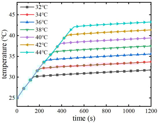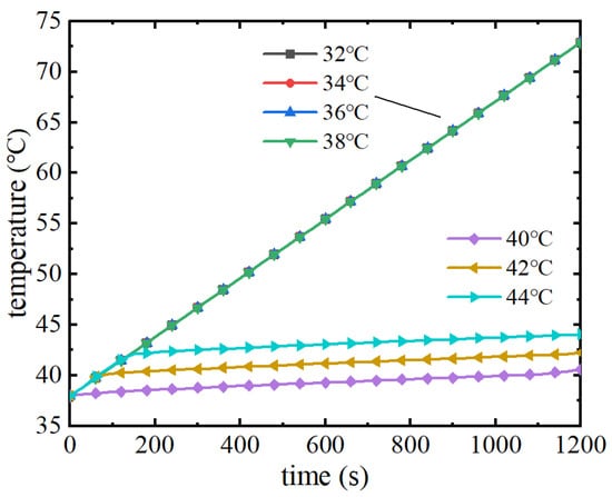 The melting point of composite phase change materials is an important parameter in determining the thermal management performance. In order to investigate the effect of the melting point of phase change materials on the thermal management performance, a group of composite phase change materials with different melting points were designed by selecting different grades of paraffin waxes for the simulation study. The thermal conductivity of this group of composite phase change materials was set to 3.0 W/(m·K) and the melting points were 32 °C, 34 °C, 36 °C, 38 °C, 40 °C, 42 °C, and 44 °C.