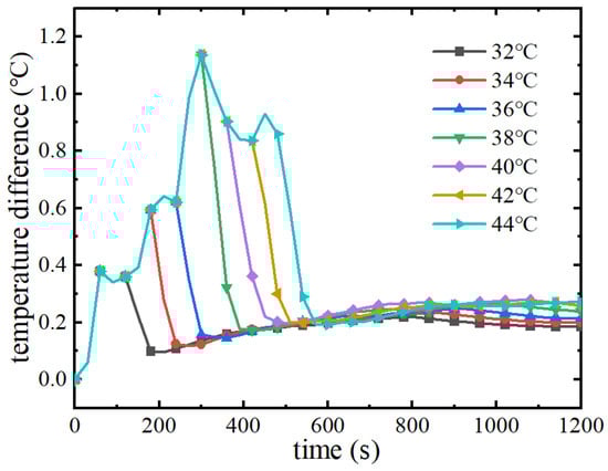 Figure 18 demonstrates the variation curves of the maximum temperature difference of the battery pack with discharge time at different melting points. As can be seen from the figure, with the increase of discharge time, the maximum temperature difference of battery packs under different phase change melting points firstly increases gradually at the same rate. Then, the temperature difference of the battery packs that first reach the phase change melting point decreases rapidly and basically remains unchanged, and the maximum temperature difference of the battery packs that have not reached the phase change melting point is still increasing. Therefore, the phase change materials with low melting points start the phase change process earlier, which will reduce the maximum temperature difference of the battery pack and improve the temperature uniformity of the battery pack. When the melting point of the phase change material is increased from 32 °C to 44 °C, the start of the phase change process is delayed by 200 s, and the maximum temperature difference of the battery pack increases from 0.39 °C to 1.15 °C. The thermal management system requires that the maximum temperature difference of the battery pack should not be more than 5 °C, and in the melting point ranges of the phase change materials studied above, the cooling of the phase change materials shows good temperature uniformity.