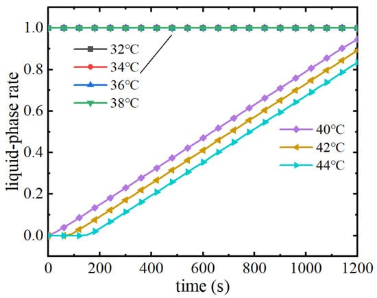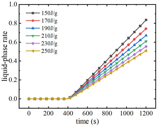 Liquid phase rate distribution of phase change materials. (a) 150 J/g. (b) 170 J/g. (c) 190 J/g. (d) 210 J/g. (e) 230 J/g. (f) 250 J/g.