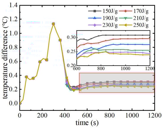 As can be seen from Figure 21, in the pre-discharge period of the battery pack, the trend of the maximum temperature rise is consistent because the phase change materials in this group have the same thermal conductivity and melting point. When the phase change melting point is reached, the phase change material uses latent heat to continue to absorb the heat of the battery pack, and at this time there is a difference in the maximum temperature change of the battery pack. When the latent heat of phase change increases from 150 J/g to 250 J/g, the maximum temperature of the battery pack decreases by 0.5 °C. The higher the latent heat of phase change, the longer the time to maintain the temperature of the battery pack near the melting point of the phase change, which improves the cooling performance of the phase change material. Figure 22 shows the variation of the maximum temperature difference of the battery pack. As can be seen from the figure, phase change materials with different latent heats of phase change in the pre-discharge period are basically the same in terms of their performance in improving the temperature uniformity of the battery pack. When the phase transition process starts, the maximum temperature difference of the battery pack decreases rapidly. The maximum temperature difference is 1.18 °C at the moment before the phase change occurs, and after the phase change starts, the maximum temperature difference of the battery pack decreases rapidly to about 0.3 °C, and then remains in a lower range. The thermal management performance of phase change materials with different latent heats of phase change is basically the same for the maximum temperature and maximum temperature difference of the battery pack.