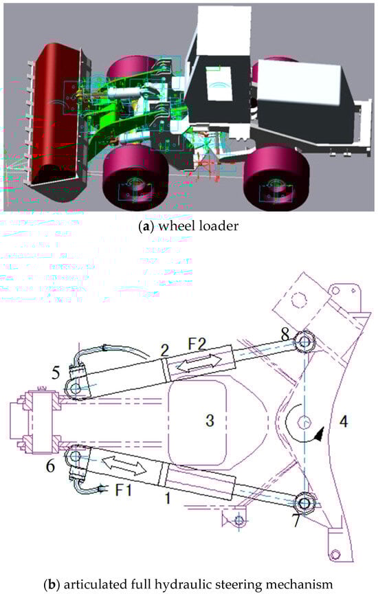 The front frame and rear frame of a wheel loader with an articulated full hydraulic steering mechanism are connected by hinged pins. The front and rear frames can be rotated around the pin shaft to obtain the relative rotation of the front and rear frames of the loader, as shown in Figure 1a. Due to the small steering radius of articulated steering, the steering distance and time are shortened, so that the loader can operate in a narrow site. The basic principle of articulated steering structure is to make the front and rear frames rotate relatively through the expansion of the oil cylinder, as shown in Figure 1b. The steering resistance of the loader is overcome by lengthening the rod chamber and shortening the rod-less chamber, so that the hinge point of the front frame and the rear frame of the loader can be rotated as the rotating center. During the steering process, the steering pump outlet oil enters the steering gear through the priority valve port. The steering device changes the direction of the hydraulic oil flow, making the hydraulic oil enter the left of the large chamber of the cylinder and the right of the small chamber of the cylinder, so as to obtain the left and right steering of the loader. When turning left to the large cavity of the cylinder and turning right to the small cavity of the cylinder, the force generated by the hydraulic oil in the left cylinder pushes the piston rod to move in the extended direction. The left turn cylinder piston rod is further and further away from the bottom of the cylinder, and the hydraulic force is F1. At the same time, the hydraulic oil of the right steering cylinder pushes the piston rod to move in the direction of the shortening of the piston rod, and the hydraulic force is F2.