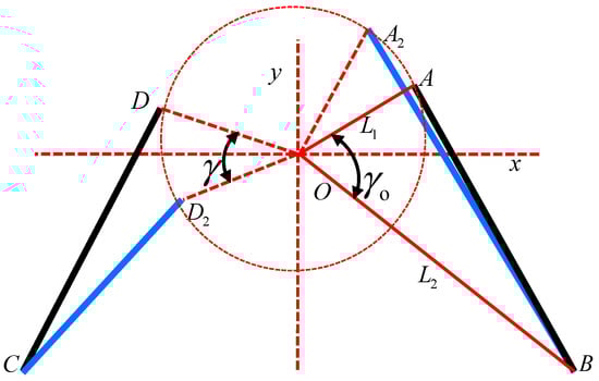 Since the coordinates of points A, B, C, and D at the left and right cylinder hinge points are , , , and , respectively, the design variables,, , , and , are determined. The maximum length of the cylinder in the limit position is as follows: