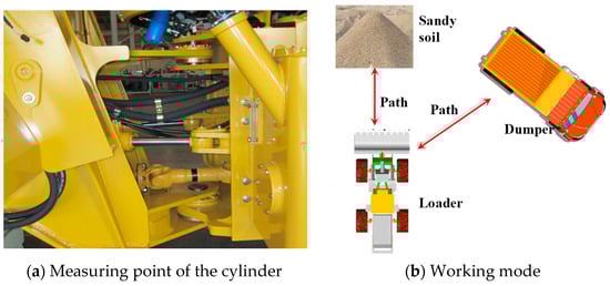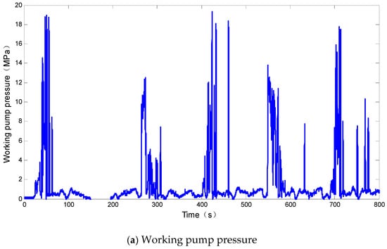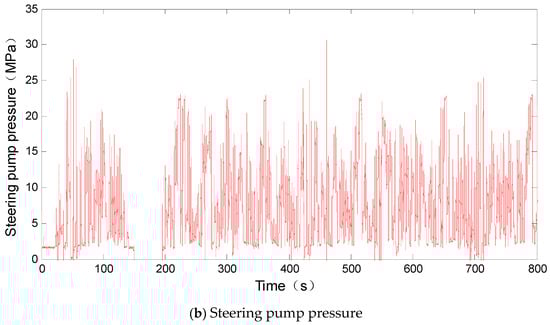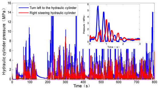 The steering hydraulic system of the loader is a coaxial flow amplification hydraulic steering system, which can improve the working efficiency of the wheel loader and greatly reduce the energy consumption. The pressure signal is transmitted to the pressure sensor during the steering process, and the signal is converted by the data acquisition system. The pressure sensor needs to be installed, respectively, in the steering pump outlet position, the working pump outlet position, the left of the hydraulic cylinder large cavity oil circuit, and the right of the hydraulic cylinder large cavity oil circuit. Then, it is connected with the data acquisition system to measure the pressure value of the steering pump and the steering hydraulic cylinder under different working conditions. The way of turning in place is that the loader turns from the left limit to the straight-line driving position and then to the right limit, and then from the right limit to the left limit. The dynamic characteristics of steering pump and steering cylinder pressure of steering hydraulic system are obtained by measuring the steering working state in real time under typical working conditions, as shown in Figure 5.