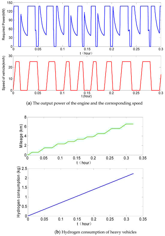 The driver’s control of the accelerator pedal and brake pedal will affect the working state of the fuel cell and motor system, the hydraulic system, and the power performance of the vehicle. In addition, the basic performance of the vehicle and road conditions will also affect the power of the construction vehicle. Under the control of the energy management strategy, it can be seen from Figure 8a that the fuel cell always operates near the maximum efficiency point during the process of providing energy to the drive motor. This can ensure that the power demand of the vehicle can be met in the shortest time when the vehicle is accelerating rapidly and driving at a steady speed and improve the power performance and energy utilization rate of the vehicle. The fuel cell hydraulic hybrid power system effectively combines the high energy density characteristics of the fuel cell with the high power density characteristics of the hydraulic system, so that the vehicle can easily meet the requirements of the vehicle’s power performance when facing the complex and changeable road conditions and a series of operations such as starting acceleration and braking are required frequently. As can be seen from Figure 8b, hydrogen consumption also increases linearly as the operating time increases, but the rate of increase remains almost constant. The energy management strategy based on driving condition recognition enables hydrogen fuel cell engineering vehicles to obtain more efficient power distribution, effectively reducing the vehicle equivalent hydrogen consumption, and improving the vehicle economy.