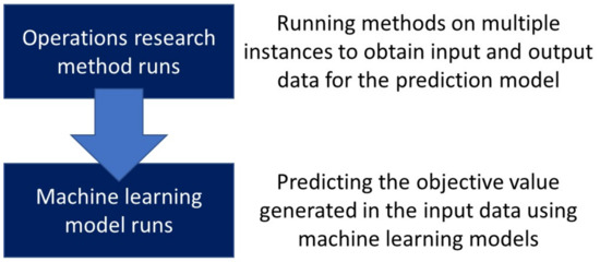In the second step of the framework (Figure 1), the machine learning model is trained and then used to predict the objective value in a much shorter time than when running operations research methods. The machine learning models predict the single objective value provided for each instance. When multiple objective values are considered, modifications could be performed with either of two options. The first involves preprocessing multiple objective values into a single weighted objective value. It includes the case in which the total costs are measured as a single value [15]. The second is applying the framework as many times as the number of objectives (and then selecting the best solution in the post-processing stage, e.g., using Pareto front analysis).