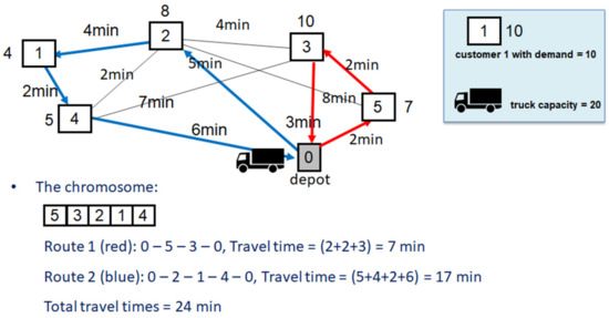 The chromosome in Figure 2 represents a single solution. Given the sequence of customers to be visited by the truck, each route is constructed by subsequently adding customers while calculating the total amount of items transported by the truck. Before the truck capacity is violated, a single truck route generation step is completed, and then another truck is scheduled to satisfy the next customer’s demands. In the considered VRP, the truck starts and ends at the depot.