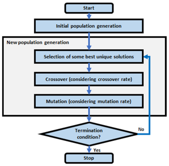 Given the population_size chromosomes in the new population, in part (3), each chromosome in the new population is further processed by applying the mutation operator. After selecting one parent chromosome using the selection probability in Equation (2), a random number between 0 and 1 is generated. The mutation operator is applied if the random number is less than the mutation_rate. Otherwise, the parent chromosome is stored as the result of the mutation operation. After applying the mutation operator, the child chromosome is selected to be stored in the new population, even though its objective value is worse than the parent chromosome. Such a selection is allowed in order to ensure good exploration while generating new solutions. The convergence of the GA is encouraged by selecting the best chromosomes before applying the crossover operator.